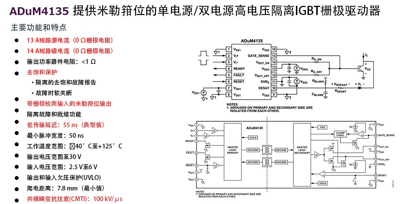 对于喜欢使用简单产品的工程师来说,ADuM4135 也是不错的选择,它是一款集成米勒箝位、100kv/uS CMTI 及 50nS 传播延迟的高压隔离栅极驱动器,如下图 (图3) 所示: