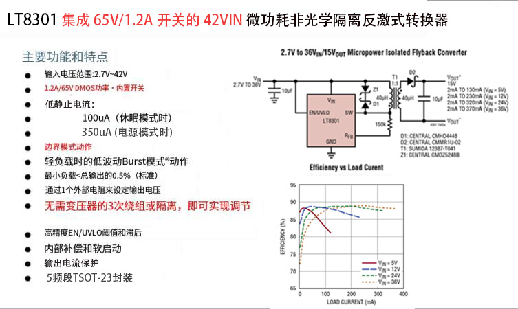 在许多牵引变频器中,六个隔离栅极驱动器中的每一个都采用了隔离电源,利用 ADI 解决方案可显著减小逆变器尺寸。下图 (图5) 为 LT8301 功能介绍,它集成了 65V/1.2A 开关,其输入电压范围为 2.7V 至 42V,非常适合采用 12V 电池的汽车应用。