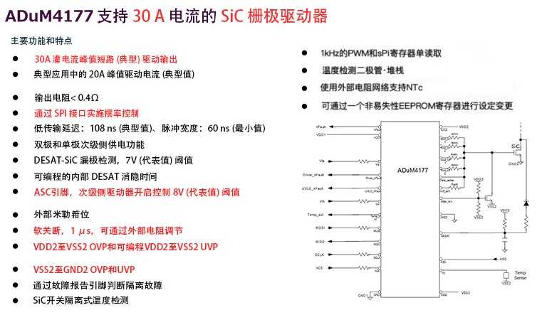 如下图 (图2) 所示,ADuM4177 是一款支持 30A 电流的 SiC 栅极驱动器,它的导通电阻小于 0.4Ω,具有业界领先的驱动能力,是 ADI 性能最高的隔离栅极驱动器件。它具有全面的保护和自诊断功能,如 DESAT、软关断、镜像钳位、电压监控和故障报告,并符合功能安全 (FuSa) 标准。它的 EEPROM 中具有可编程寄存器,可通过 SPI 进行访问,还可选择压摆率。