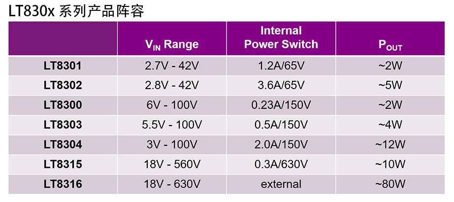 如果需要更大的电源电流,还推荐使用集成 65V/3.6A 开关的 LT8302 隔离式电源控制器,ADI 还有多种其他产品阵容,如下图 (图6) 所示,因此可以根据输入/输出规格进行选择。