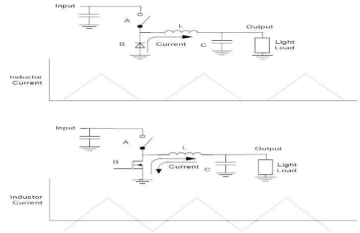 在低功率负载和二极管开关B的情况下,电感将在部分周期内停止导通——我们已经看到了这种电流断续模式(DCM),这种架构对于低功率系统可能会更便宜。MOSFET允许反向电流和连续导通,在一个方向或另一个反向方向上。这种连续传导模式(CCM)工作在轻负载电流情况下,效率会低一些,但是在大负载电流情况下,效率更高。在可能的情况下,应使用智能控制电路在低负载输出情况下来切换模式,以优化效率。
