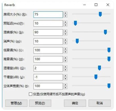 - 干湿比:干声信号和混响信号的比例,调节直达声以及混响信号的分量比重。