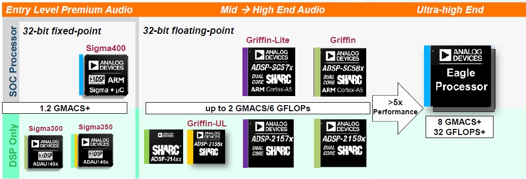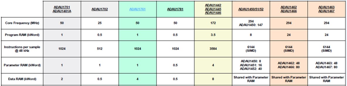 众所周知,ADI 在音频的 DSP 上相当有竞争力,从 Sigma 到 Sharc 类的 DSP 均运用于各类音频电子产品中。如下图 (图2) 所示为 ADI SigmaDSP 产品选型对比表: