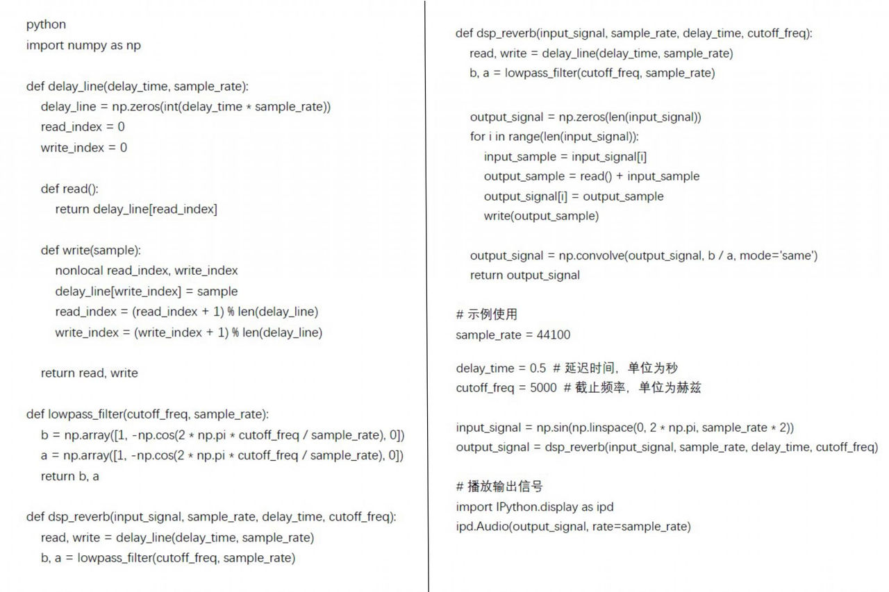 创建一个 DSP 混响的效果器。以下图 (5) 是一个使用 Python 和 NumPy 库实现简单 DSP 混响效果的示例代码:
