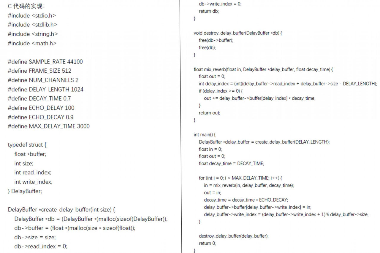 如上图 (图6) 所示的代码是一个简单的 DSP 混响效果实现,它使用了 C 语言进行编程。代码主要有以下操作: