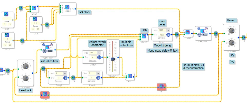ADI SigmaDSP 的产品是定点的数字信号处理器,而 SharcDSP 即全浮点的数字信号处理器。全浮点的 DSP 可以处理复杂度比较高的混响,SigmaDSP 一般用于处理一些简单一点的混响。以下将展示一些 ECHO 类混响在 DSP 上的应用实现,目前混响主要对内存的空间需求是比较多的,存在着很多 Delay。ECHO 类混响在 ADAU1701 和 ADAU1761中 的实现如下图 (图4) 所示: