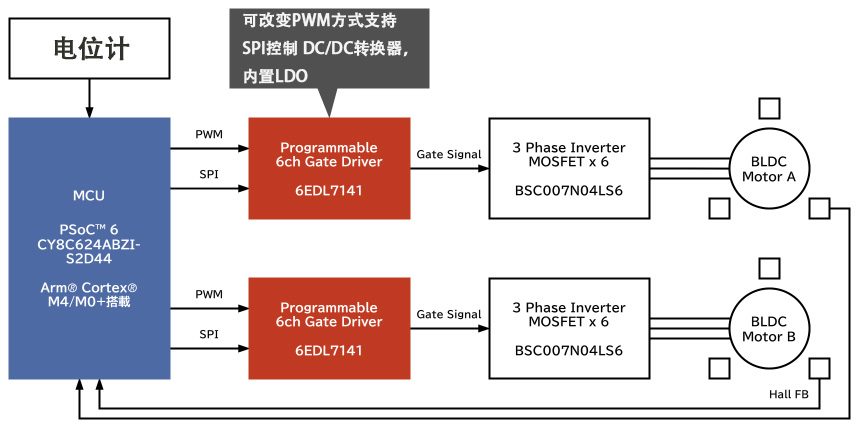 随着 MCU 功能和性能的提高,从单电机/单 MCU 到多电机/单 MCU 进行控制,实现了系统的小型化和系统成本的降低。本文主要介绍 Macnica 使用英飞凌产品实现单个 MCU 驱动两个 BLDC 电机的解决方案。